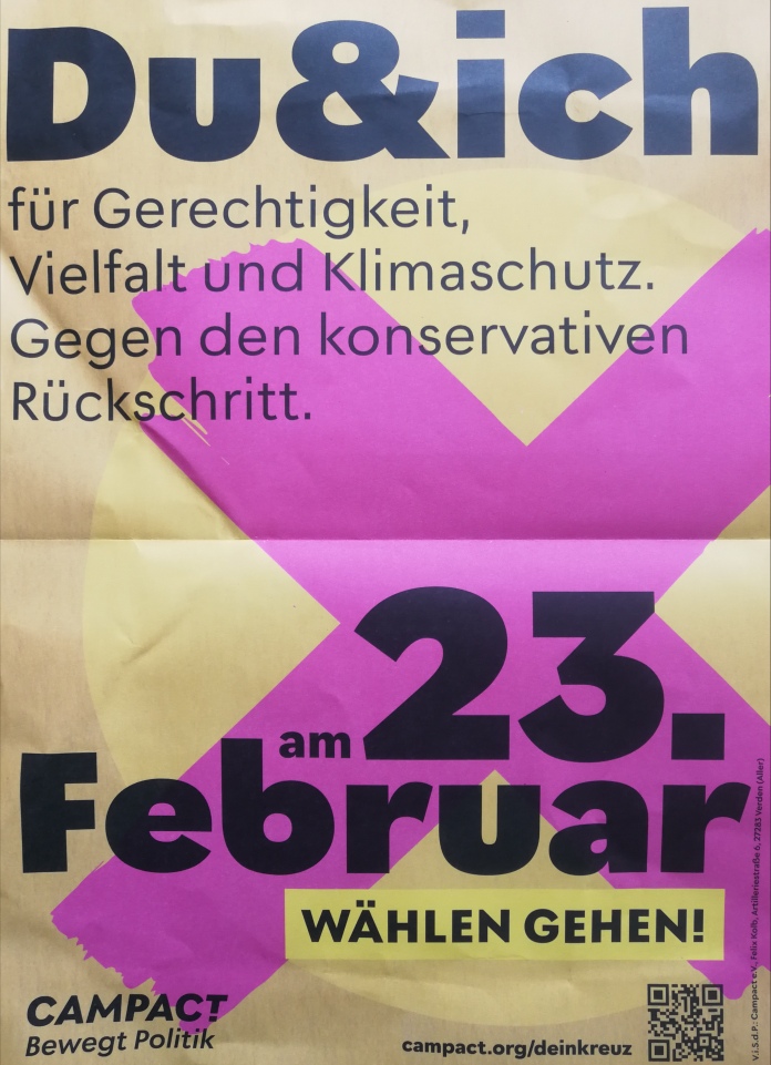Ich bin keine Expertin der Parteiprogramme von AfD und CDU, aber das, was ich im Vorfeld der Wahlen gelesen und in Nachrichten gesehen habe, verschafft mir das kalte Grausen. Die einen wollen den Austritt Deutschlands aus der Europäischen Union und dem Euro-Raum, die anderen halten an der Atomenergie fest und wollen den Klimaschutz hinter wirtschaftlichen Interessen anstellen. Die einen wollen mehr Videokameras und automatisierte Gesichtserkennung, die anderen wollen das Bürgergeld abschaffen. Die Cannabis-Legalisierung soll Rückgängig gemacht werden, der Paragraph 218 nicht abgeschafft werden, Migration soll mit Maßnahmen gestoppt werden, die dem Europäischen Prinzip und dem Völkerrecht widersprechen, die einen schüren Hass gegen den Islam die anderen gegen die freie Wahl der Geschlechteridentität und gegen Wokeness…